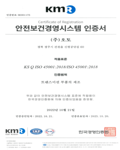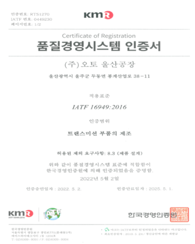 트랜스미션 부품의 대한 인증을 취득하여 유지하고 있습니다.